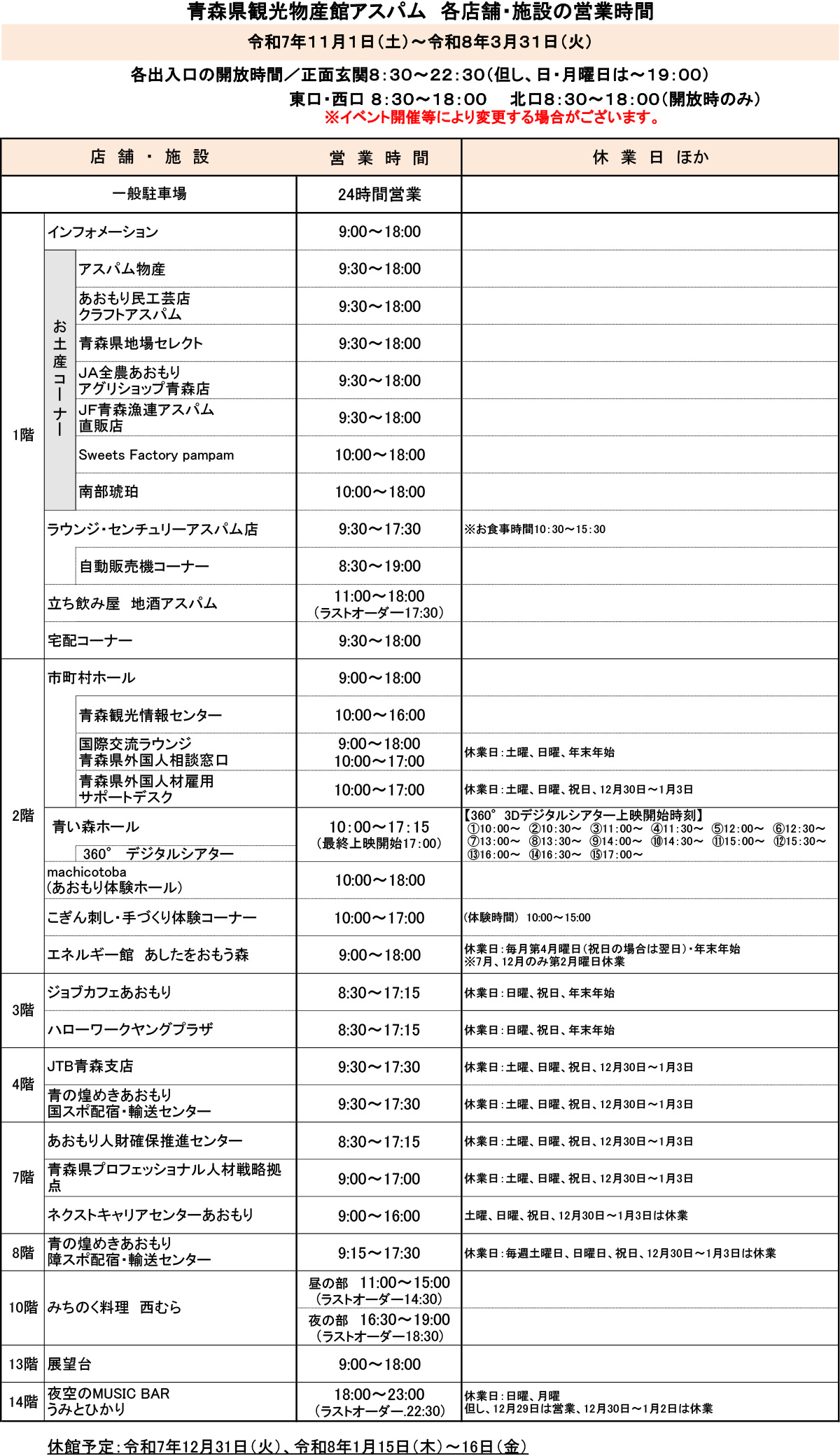 青森県観光物産館アスパム 各店舗の営業時間【2025年11月1日~2026年3月31日】